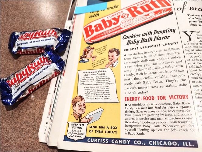 Dubiously, the Baby Ruth bar from the magazine is featured thus: “As nutritious as it is delicious, Baby Ruth Candy is a first line food for defense against fatigue.” Hmm, if you’re a hungry soldier fresh from basic training then I can buy that (and they were back during 1942), but for our sedentary world today, probably going easy on the candy bars is a better bet.